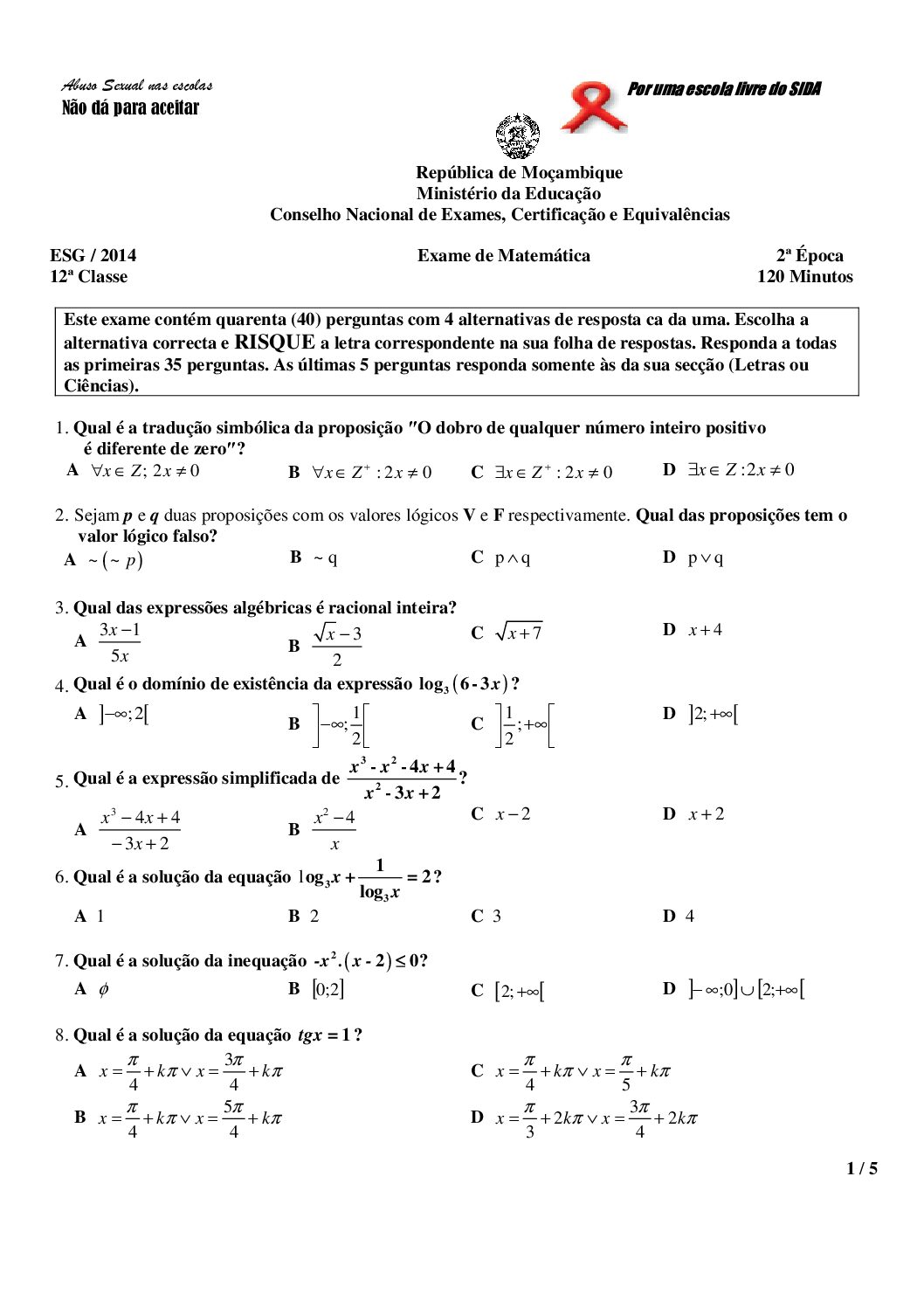 Matemática 2014 – 2ª Chamada da 12ª classe (Enunciado do Exame em PDF)