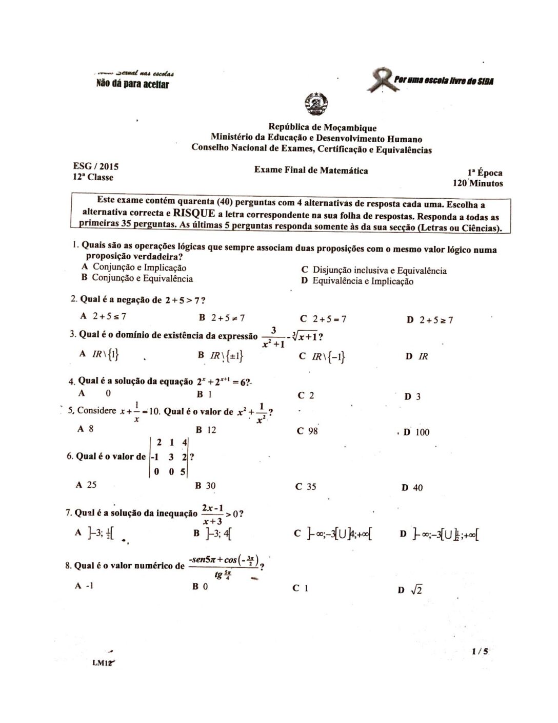 Matemática 2015 – 1ª Chamada da 12ª classe (Enunciado do Exame em PDF)