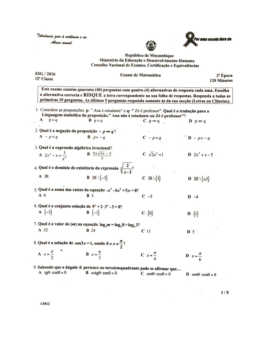 Matemática 2016 – 1ª Chamada da 12ª classe (Enunciado do Exame em PDF)