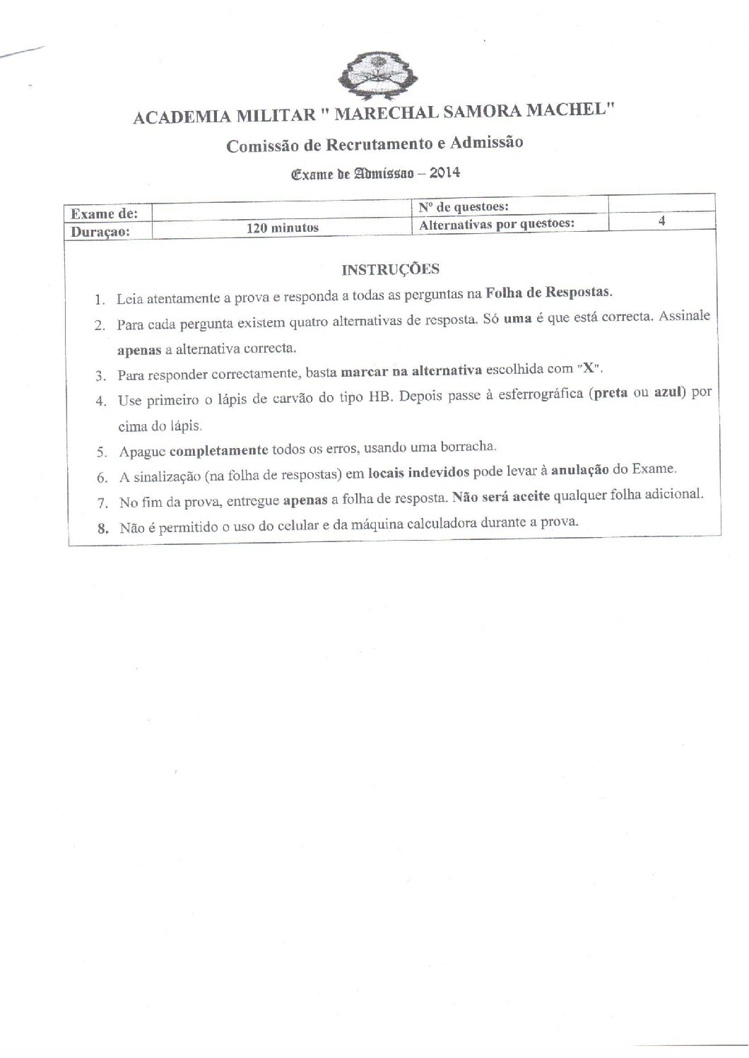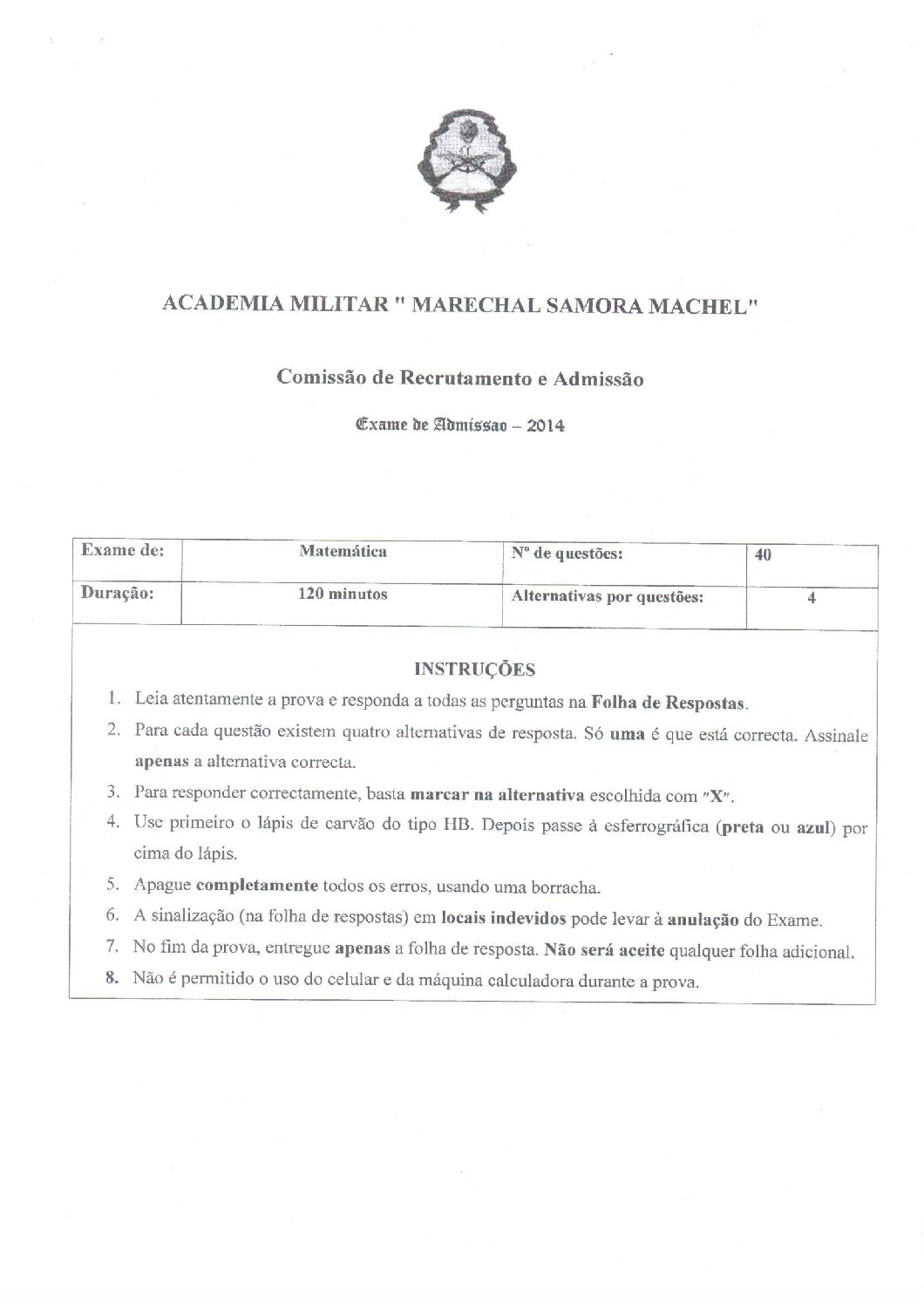 Matemática – 2014 da Academia Militar (Enunciado do Exame de Admissão em PDF)