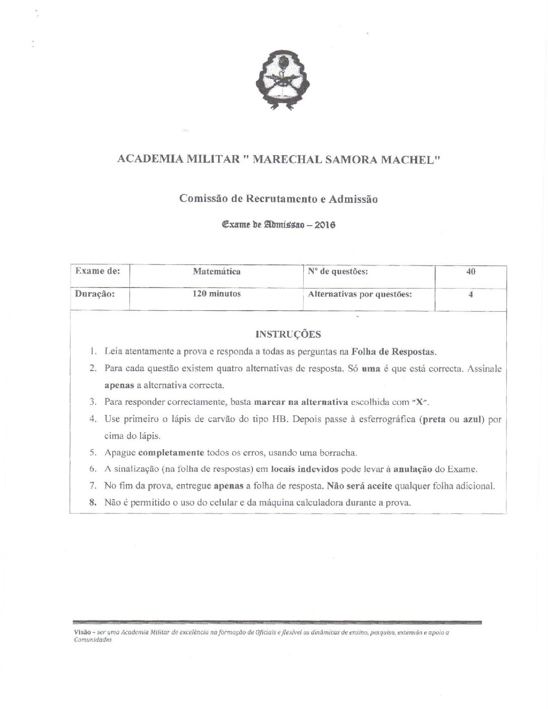 Matemática – 2016 da Academia Militar (Enunciado do Exame de Admissão em PDF)