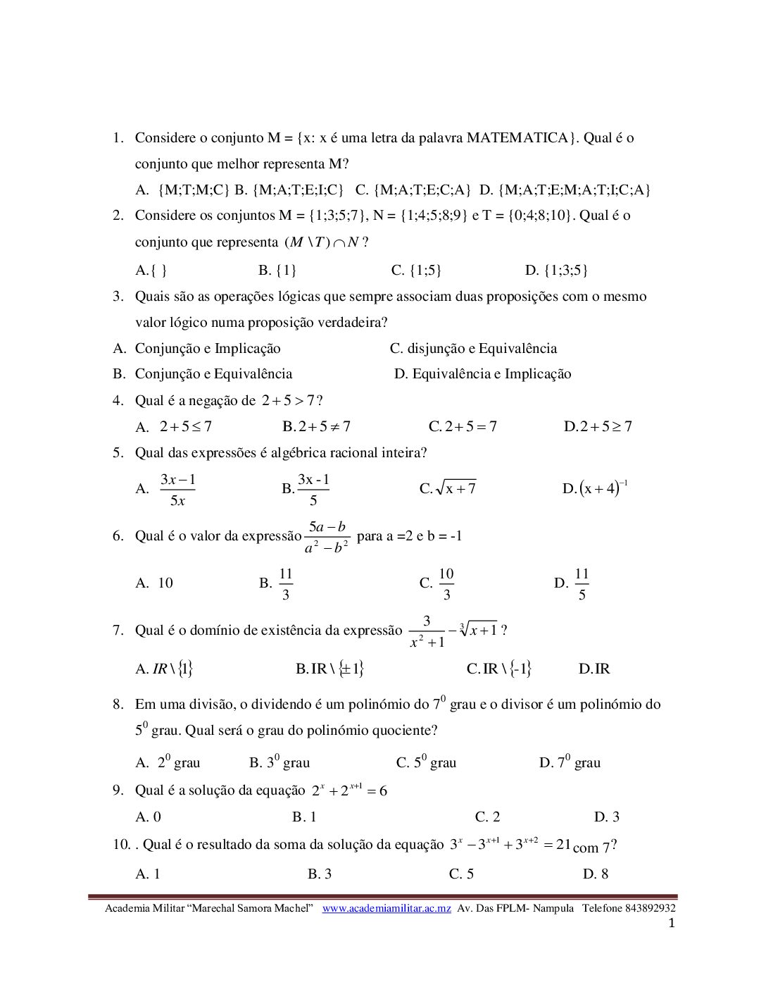 Matemática – 2017 da Academia Militar (Enunciado do Exame de Admissão em PDF). Baixe grátis em formato PDF para estudo e preparação....